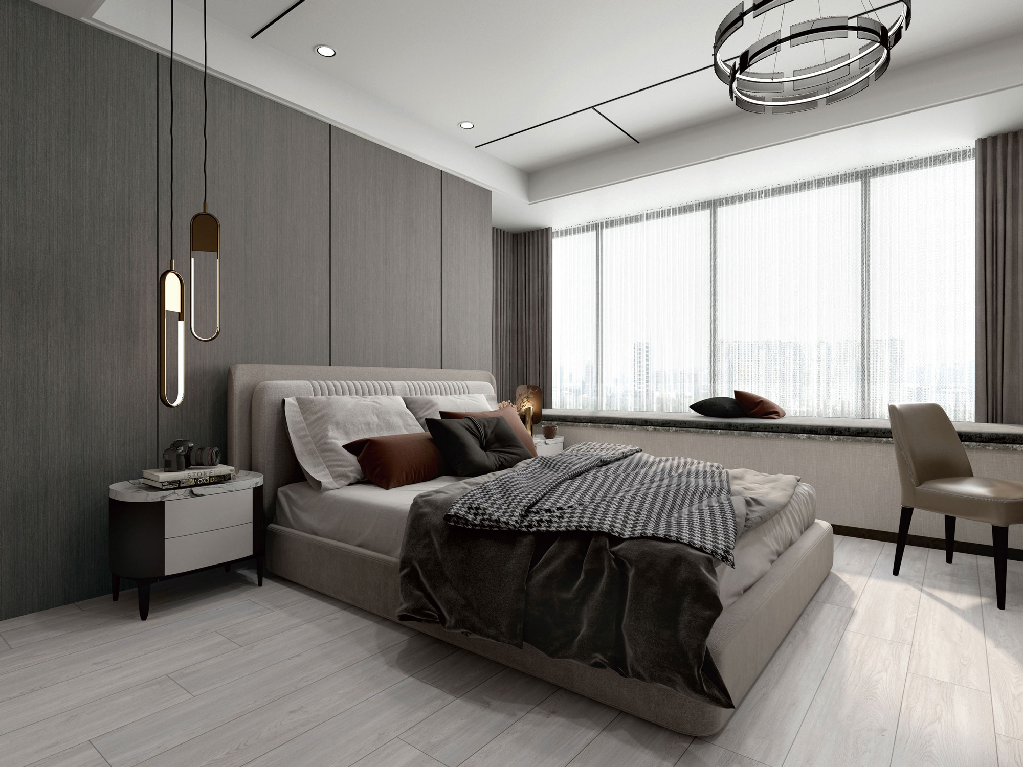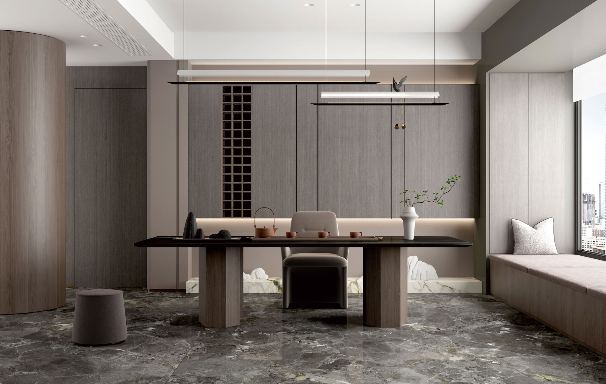 以樹(shù)木紋為創(chuàng)作靈感,淺灰細(xì)紋錯(cuò)綜交纏,賦予空間更多自然雅致的氣質(zhì)。