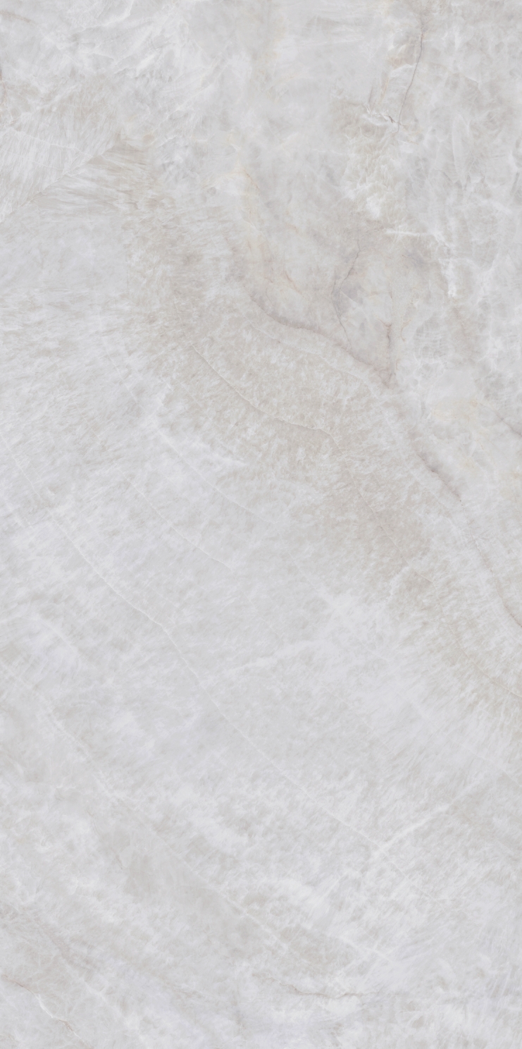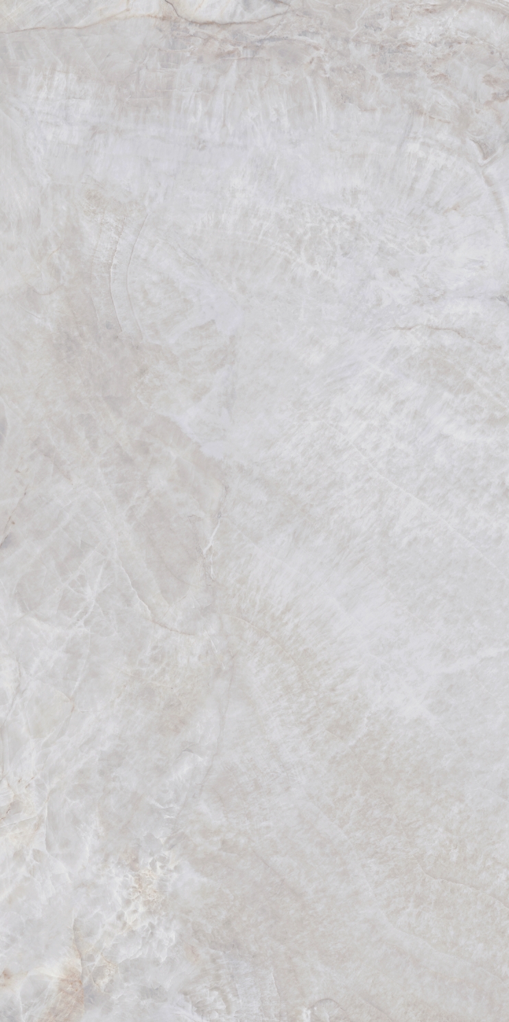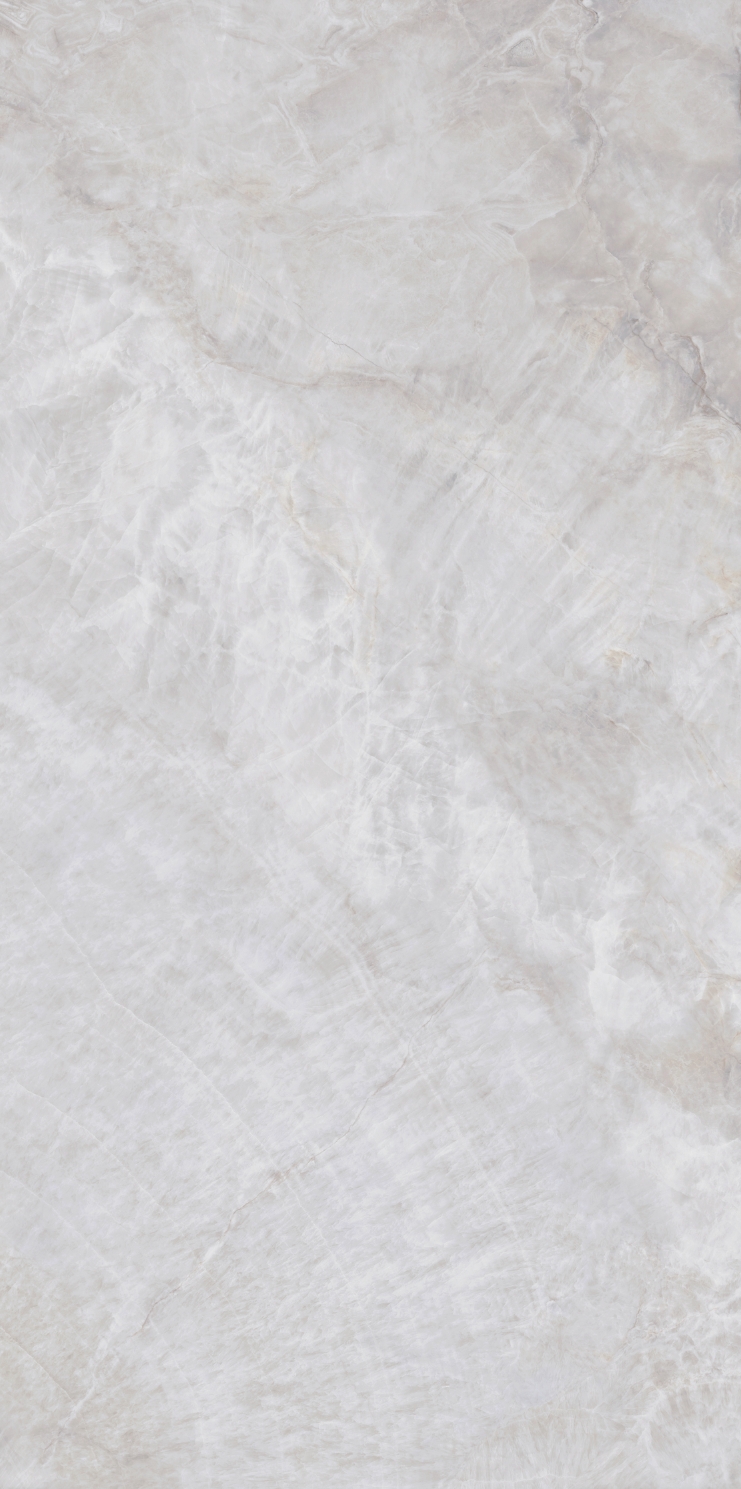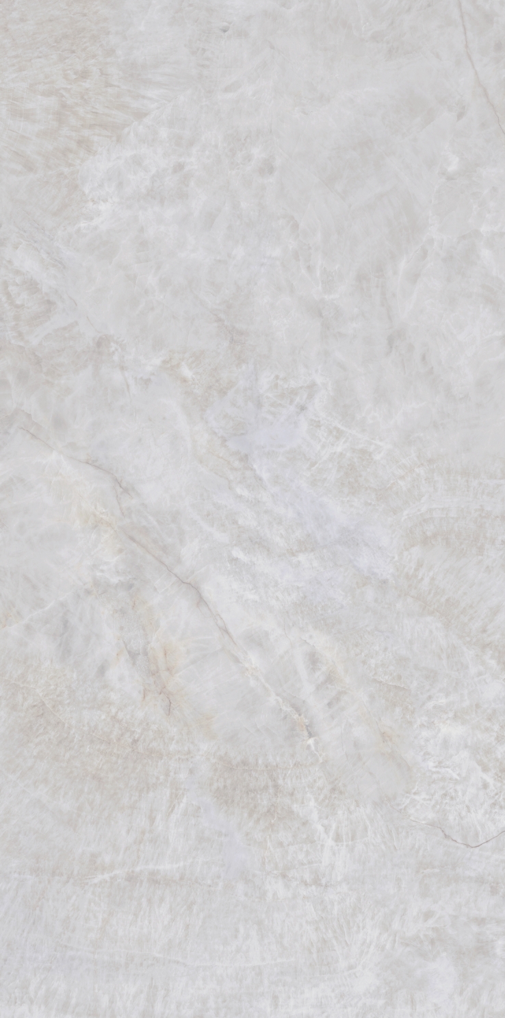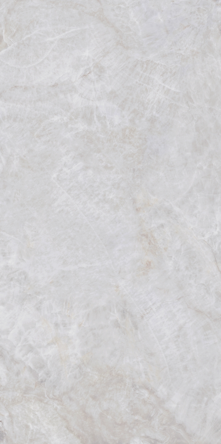 銀灰色的磚面上附著這大片絮狀紋理,形成了絢麗的銀灰色版面,猶如云母貝獨(dú)特的生長紋,高透柔美的玉質(zhì)凝脂感和均勻的質(zhì)地,在光線照射下泛起溫婉細(xì)膩的虹彩。